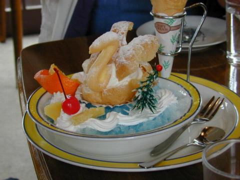右のはシュークリームの白鳥がかき氷の湖に浮いています。