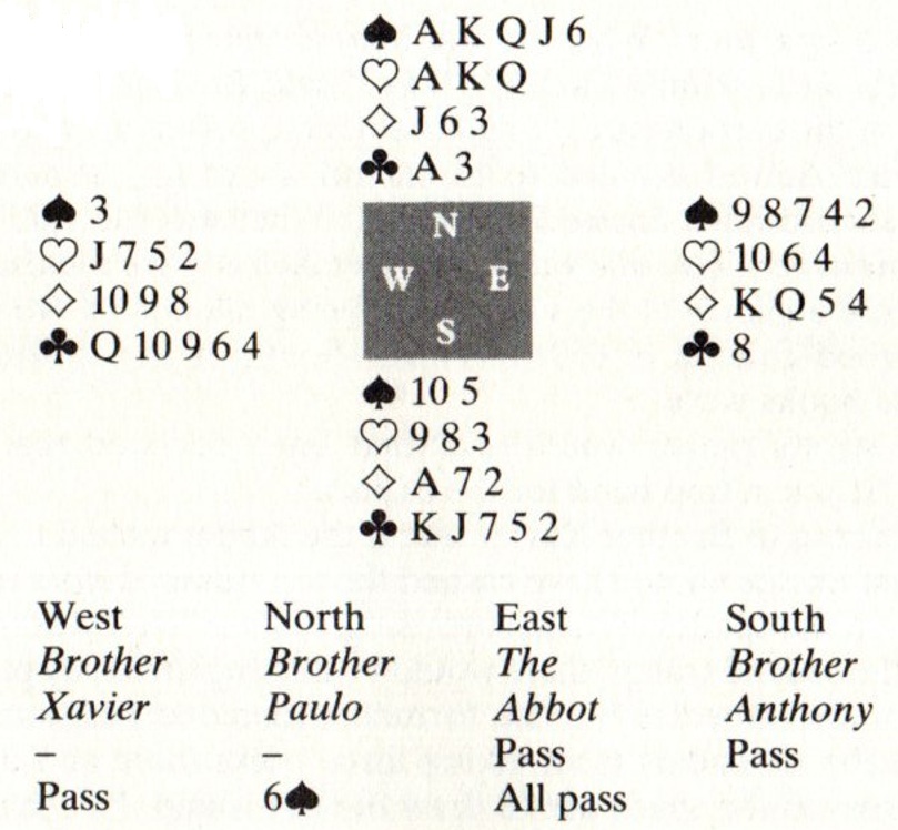 ・ザビエル修道士は♦Tと自然なリード。それから修道院長の方を向いて、ペナルティなしでカードを戻すように示しました。 その後、♦J,Q,Aとカバーされました。 ・続く2ラウンドの切り札狩りで、 トランプの5-1別れが分かりました。