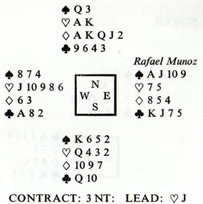 しかし、3トリック目で♣Kをリードすることを思いついたのは、 ラファエル・ムニョスのようなアーティストだけだったでしょう。 |
