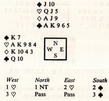 コントラクト:3♠ ・オープニングリードは♥K。 ディクレアラーがラフ。 ・そして、♠3をプレーしました。