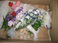翌13日、ちょっと大き目・浅目のダンボール箱に化粧紙を張って簡易棺《右を参照》とし、その中にごんべを安置して庭の花(少しで御免!)で飾り、大和高田バイパスを西に飛ばして二上山麓の動物霊園に運び、簡単なお葬式をしました。「本日担当の老住職」(^^)が、舎利禮文などを読経し、ごんべ夫婦も神妙に焼香をしました。骨は共同墓地に納めてもらうように手続きをしましたが、荼毘に伏すのは14日(水)とのことでありました。