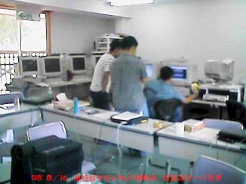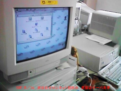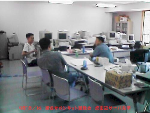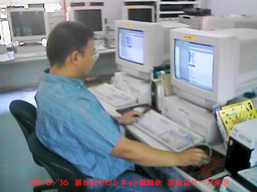 | 親睦会の進行 8/15 14:00 − 18:00 サロンネット会長(一応私です('^^;))の自宅でパソコンについての雑談 8/16 14:00 − 17:00 京田辺サーバ見学 (デジタルカメラで撮影してきました。) 当日の話あった内容 8/15 今後のサロンネットメンバーでの専用線導入に向けて話し合いました。 それから私の主要で近くのパソコンショップでTA(NEC