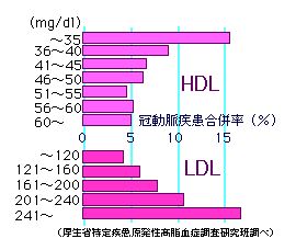 下の図でHDL、LDL別に見た冠動脈疾患合併率のデータを示します。HDLコレステロール、LDLコレステロールがそれぞれ上の表で見た正常範囲をはずれると冠動脈疾患をおこしやすいことがわかります。