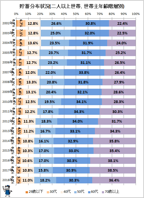 一方で、2人以上世帯に限れば、2018年度貯蓄総額の4割近くが70歳以上の世帯で占められており、60歳以上に区切れば7割近くとなる。