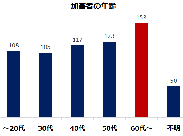鉄道での暴力行為を行なった加害者の年齢で一番多いのは「60代以上」で、全体の23%、加害者の年齢が高くなるにつれて、暴力行為の件数が増えていく傾向がある。