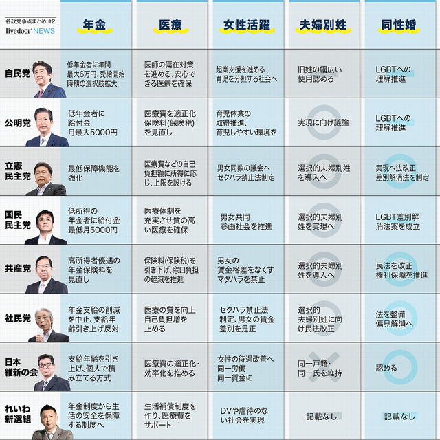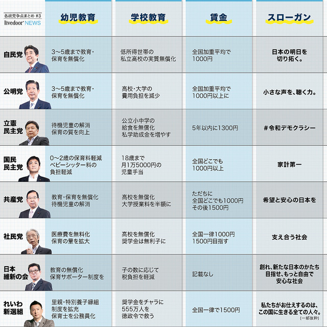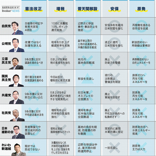 それから10年後、第25回参議院議員通常選挙は、2019年(令和元年)7月28日の任期満了に伴い、7月21日に投開票されたのであるが、各政党のマニフェスト対比は以下のとおりである。