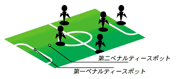 反則に関しては第2PKマークからの直接フリーキック(壁なし)。